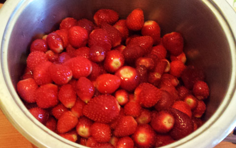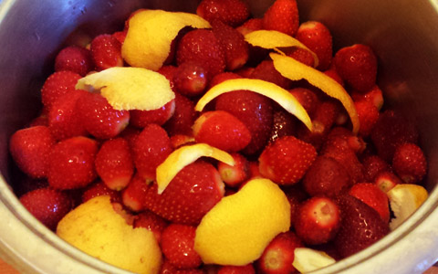 1. Lava le fragole e rimuovi il picciolo e le foglie. Tagliale a cubetti e raccoglile in una ciotola. Aggiungi anche i limoni tagliati a fettine sottilissime. Copri la frutta con lo zucchero, mescola, e falla macerare per almeno 2 ore, fino a che lo zucchero non si sarà sciolto trasformandosi in uno sciroppo.